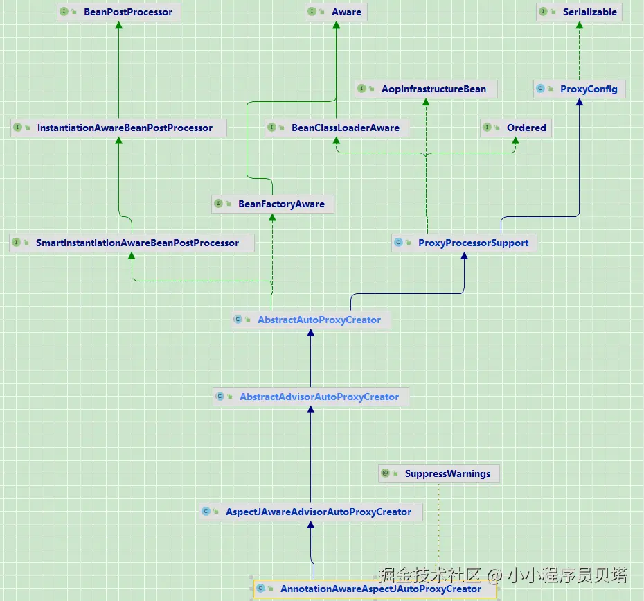 一个是 AutoProxyRegistrar , 这个类主要向容器中注入 InfrastructureAdvisorAutoProxyCreator 这个用于处理 AOP 的BeanPostProcesser ,而一般情况下由于我们系统会添加 AspectJ 风格的注解 @EnableAspectJAutoProxy ,所以系统中最终用于处理AOP的BeanPostProcessor最终是 AnnotationAwareAspectJAutoProxyCreator ,而这个类也是一个BeanPostProcessor,它会在Bean创建时的初始化阶段对Bean的实例进行切面逻辑,这个类也非常重要,会在下面的解析中再次出现