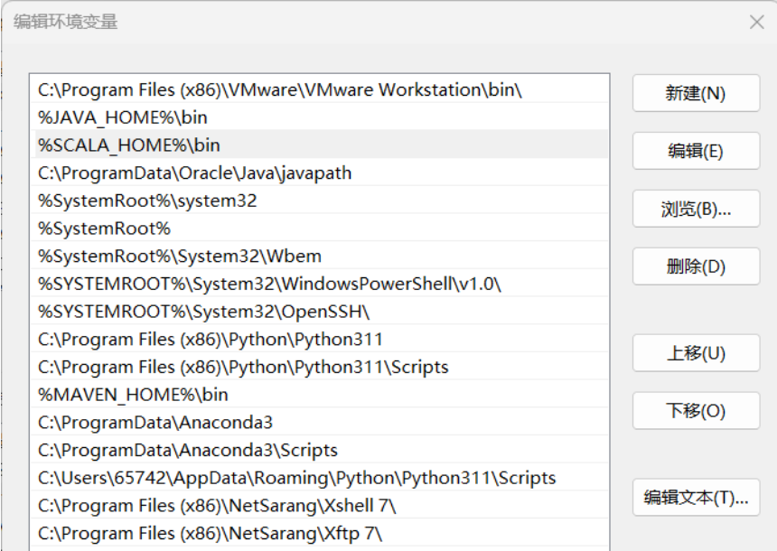 找到系统变量下的"Path"如图,单击编辑。然后新建,添加如下的路径: %SCALA_HOME%\bin;