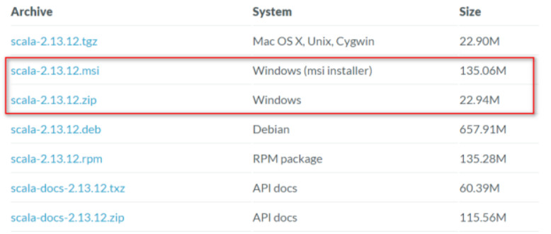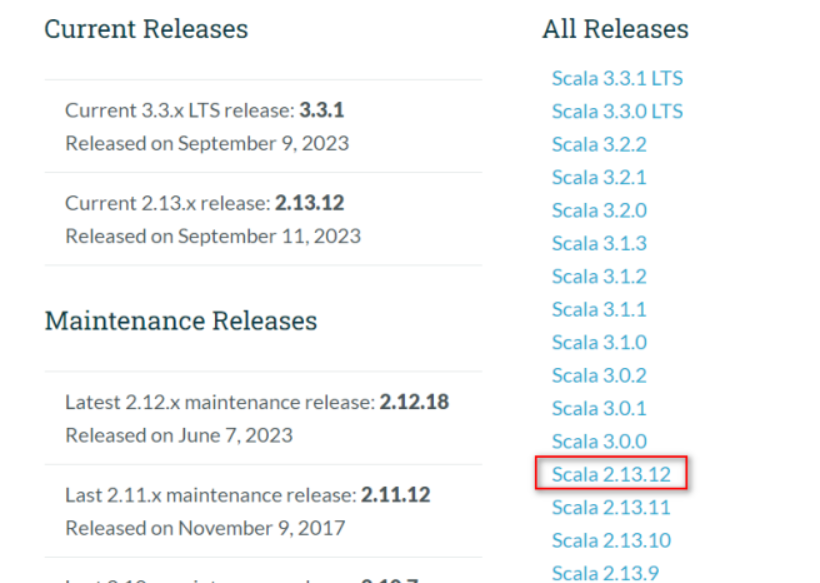 接着我们从Scala官网地址 https://www.scala-lang.org/download/all.html 上下载Scala二进制的包。