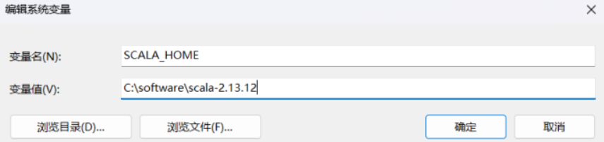 单击系统变量的新建,在变量名栏输入:SCALA_HOME: 变量值一栏输入 Scala 的安装目录。