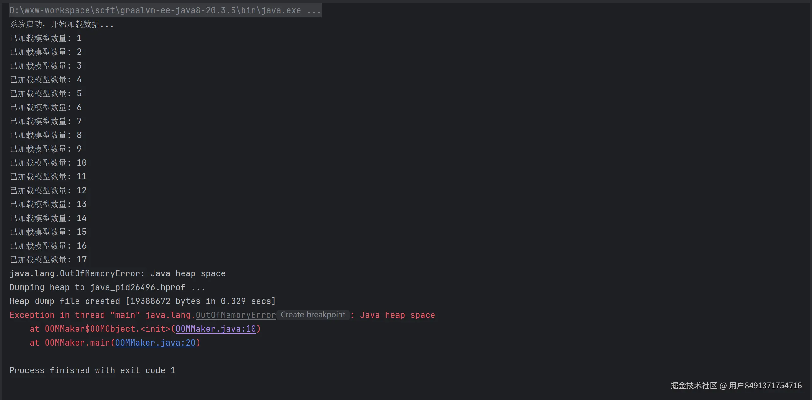 当程序运行时,它将不断分配内存直到 20MB 耗尽,随后抛出 OOM 错误并生成堆转储文件。