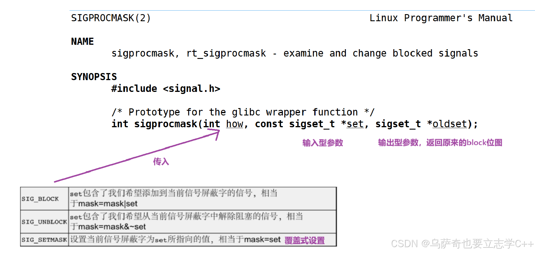 该系统调用可以修改信号的BLOCK位图,并设置进内核,该系统调用有三种设置方式,具体调用哪种有传入的第一个参数决定,当传入SIG_BLOCK时是新增屏蔽某一个或几个信号,具体有第二个参数set决定,当传入0010时说明新增屏蔽2号信号,当传入SIG_UNBLOCK时是解除某一个或几个信号的屏蔽,当传入SIG_SETMASK时是覆盖式的重置信号位图。