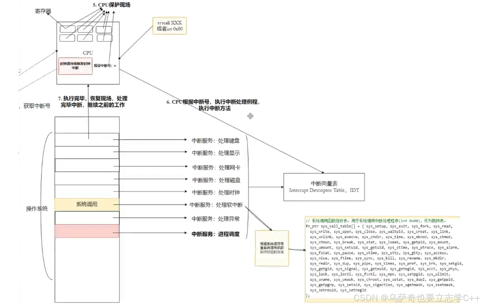 3、为了让操作系统⽀持进⾏系统调⽤,CPU也设计了对应的汇编指令(int 或者 syscall),当CPU执行这两条汇编指令时就会在CPU内部触发特定中断号的中断逻辑。