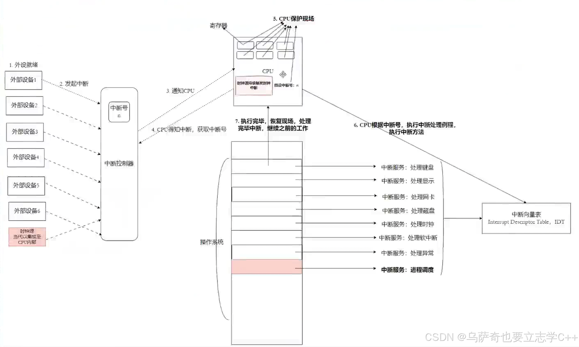 4、这种触发中断的方式叫做软中断,特点是不需要外部硬件触发,而是CPU通过软件的方式触发的,这样就可以通过软件编程的方式,让CPU进入中断的处理例程中。