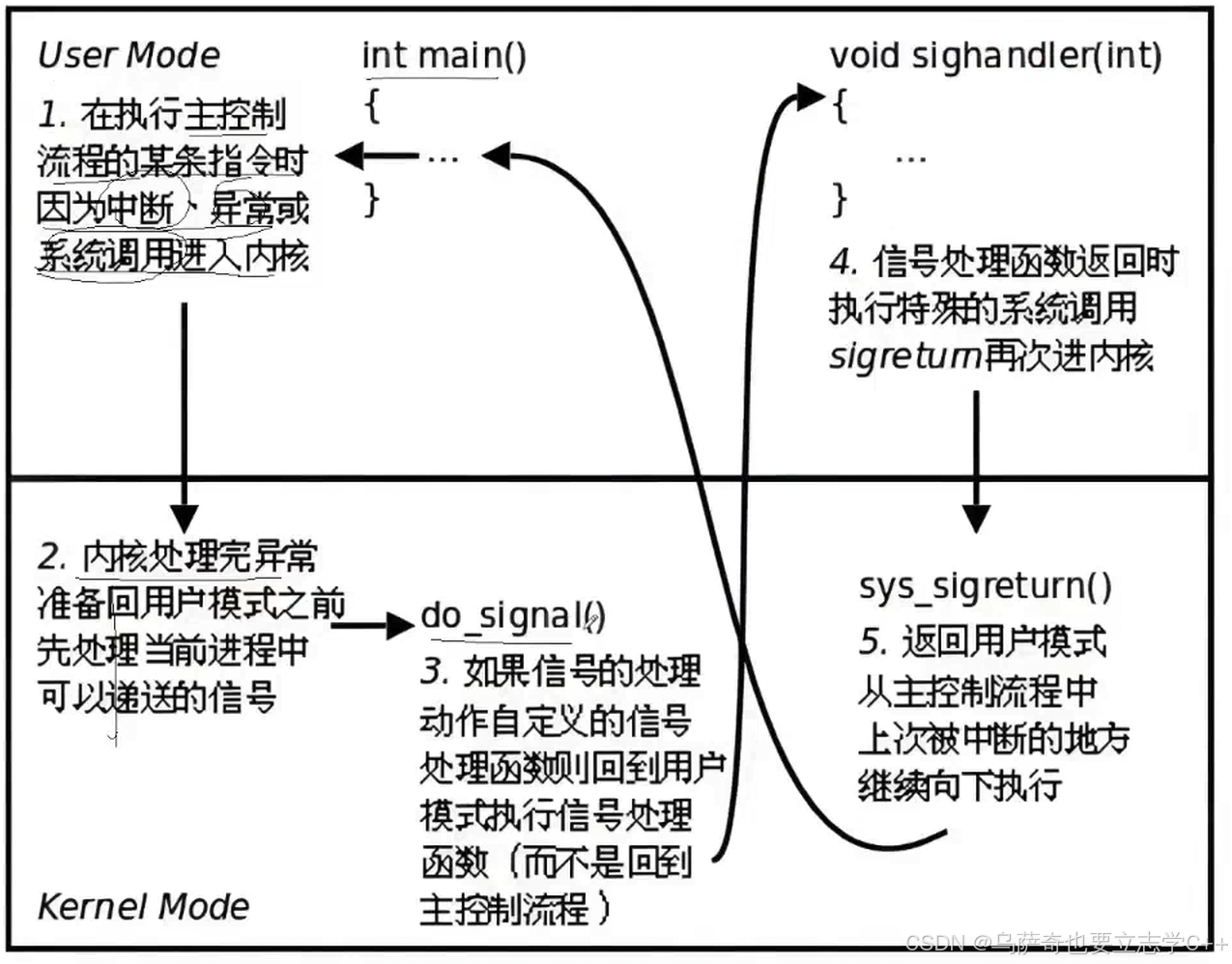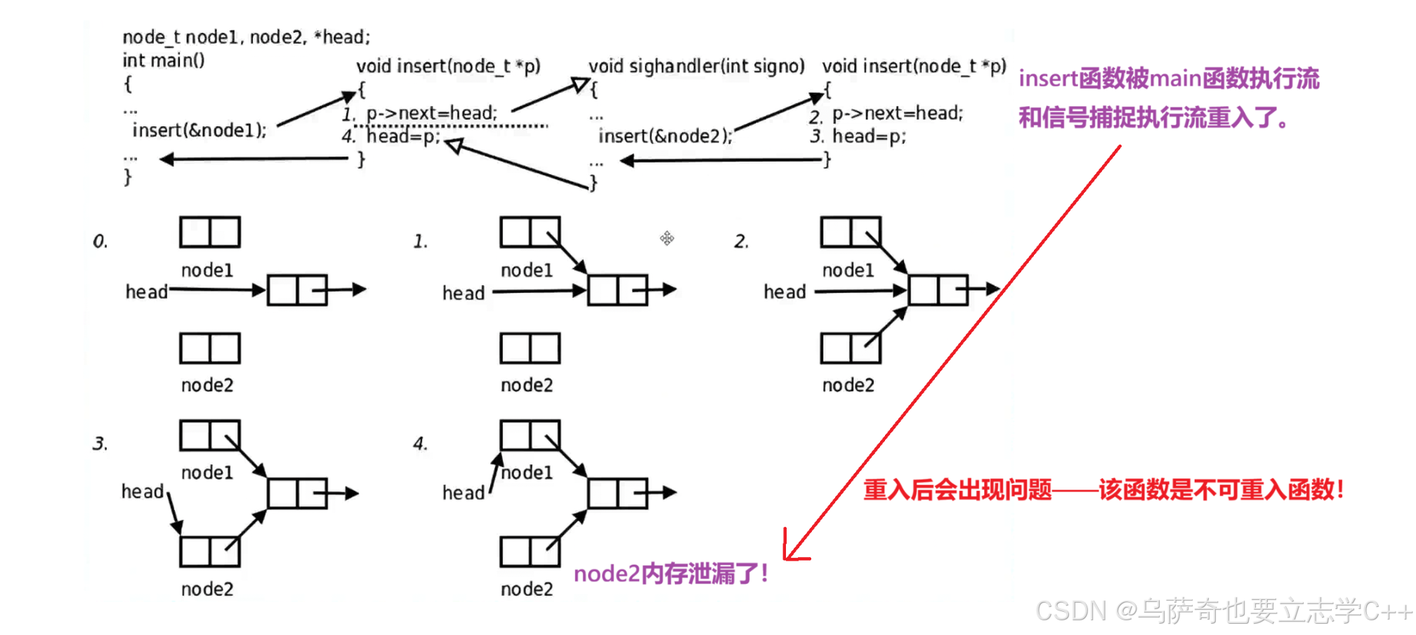 4、main函数执行流和信号处理handler执行流是两套不同的执行流,虽然执行者都是同一个进程,当main函数执行流和信号处理handler执行流执行同一个函数时,就会发生重入问题。