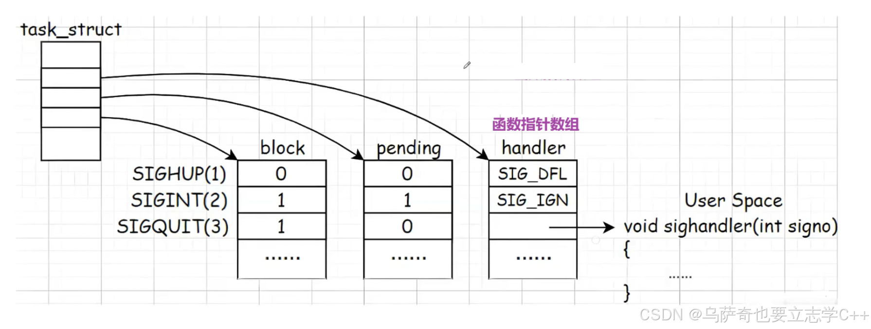 我们可以看到task_struct中有三张位图结构,三张位图的某一个特定比特位对于一个信号,所以我们未来对信号做操作本质就是对这三张表做操作,我们之前介绍的signal系统调用本质就是对handler做设置。