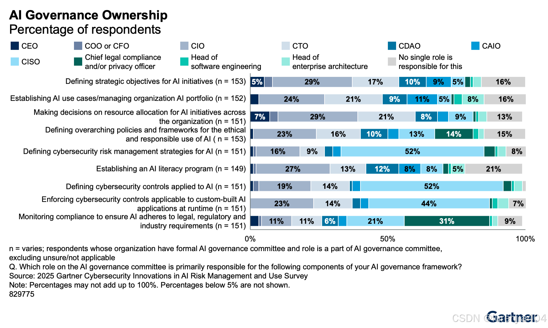 大多数组织都认识到这种责任划分,只有 13% 的首席信息安全官表示他们负责管理人工智能的合乎道德或负责任的使用(见图 1)。