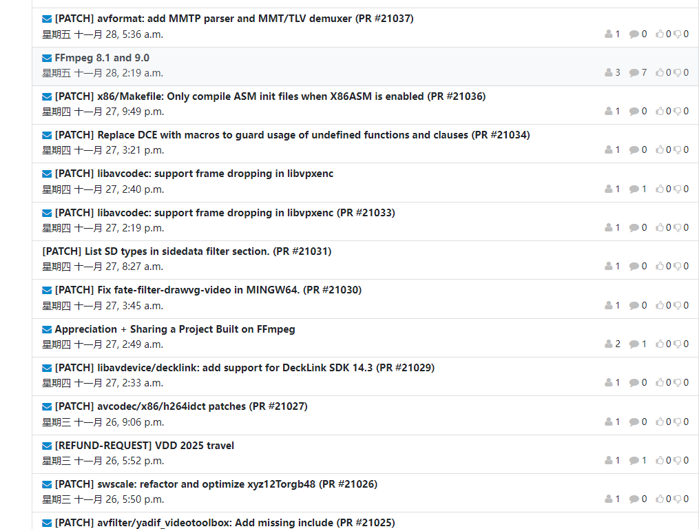 提交后,在https://lists.ffmpeg.org/archives/list/ffmpeg-devel@ffmpeg.org/可以看到自己的提交,邮箱也会收到邮件。