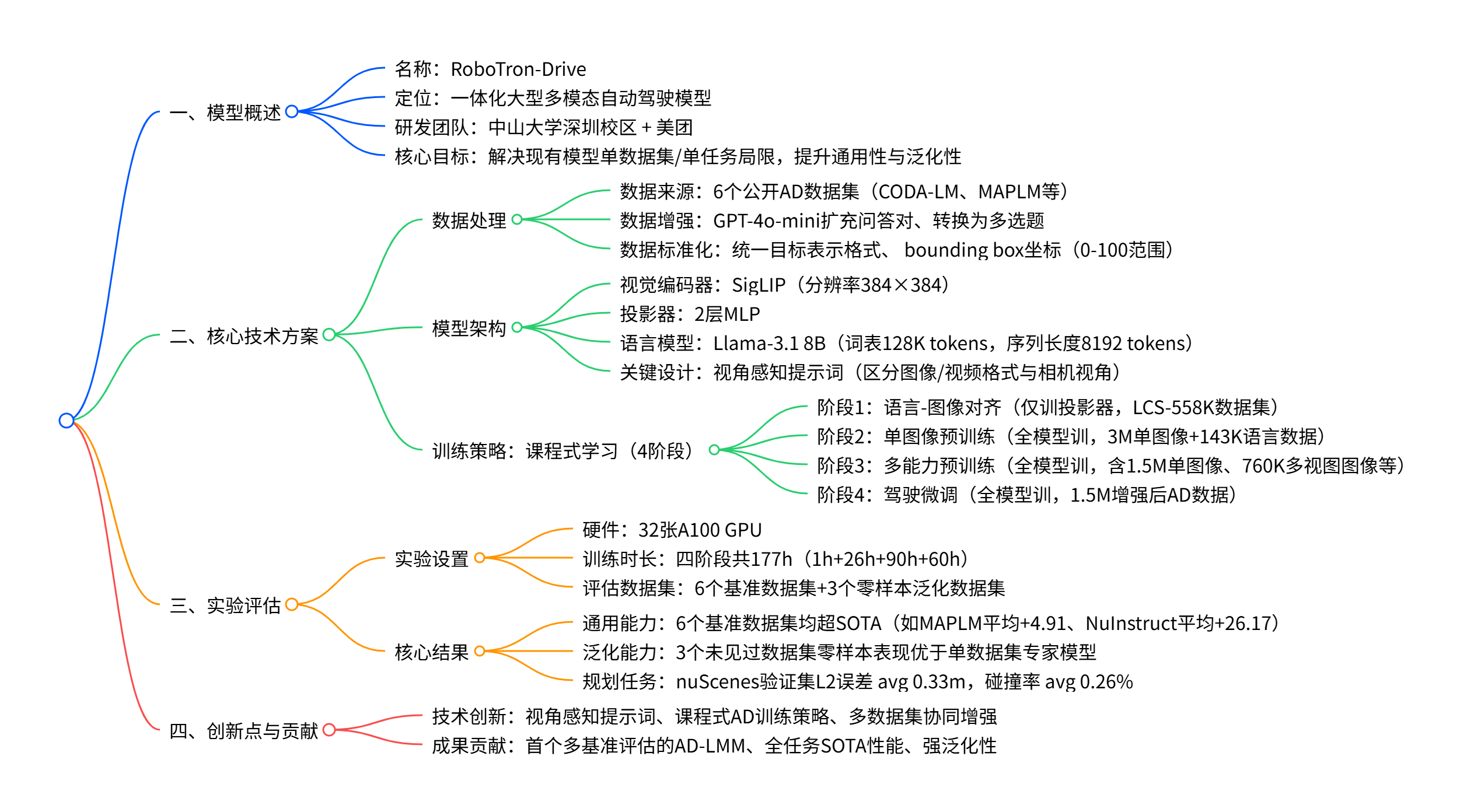 - 提出首个一体化自动驾驶多模态模型RoboTron-Drive,可处理多输入格式、完成全流程 AD 任务;