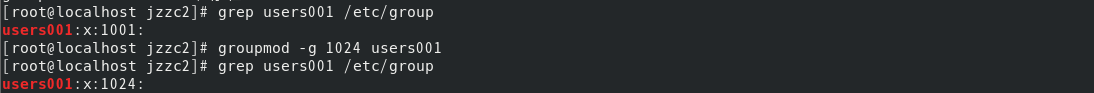 groupmod -g 1024 users001 # 更改组users001的GID为1024