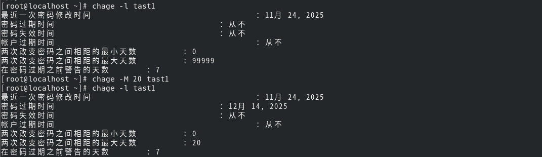 chage -M 20 tast1 # 更改tast1用户的密码有效时间为20天