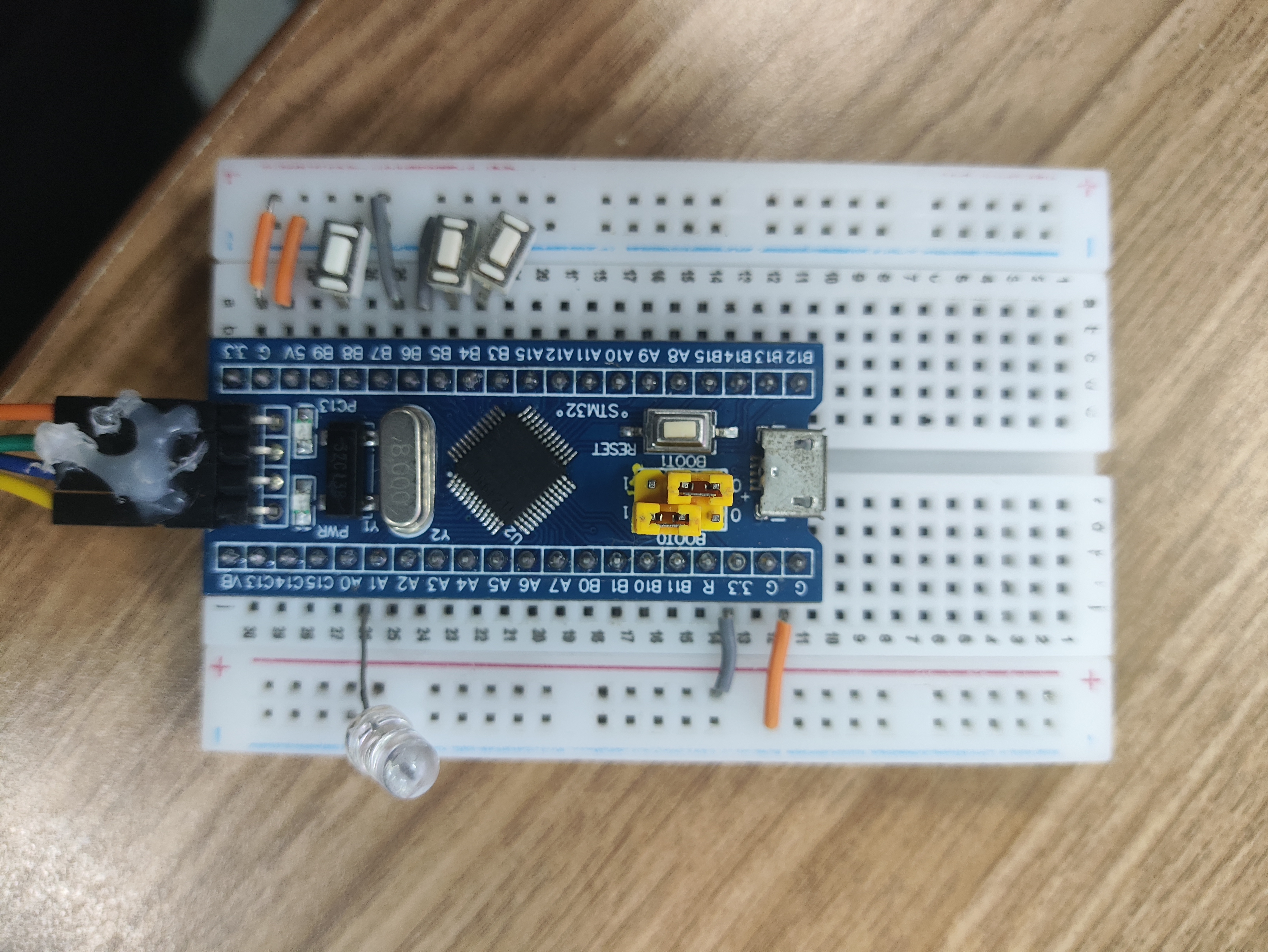 然后我就查资料试了一下,解决方法为断电后把boot电路上面的boot0跳线帽改为1(高电平),boot1保持原样为0(低电平)然后再连接尝试上电烧录,就成功了。