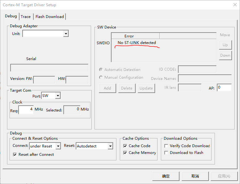 (前提,要确定stlink跟32板子没坏,能供电)解决方法:我是看到debug里的stlink的setting里显示未连接SWD IO, 即类似于