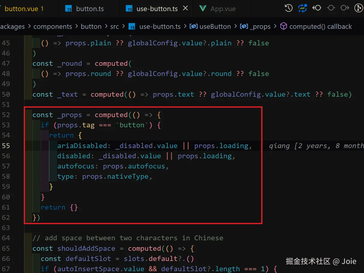 - 默认 tag = 'button' → 渲染成原生 ,带上 disabled、type 等属性。