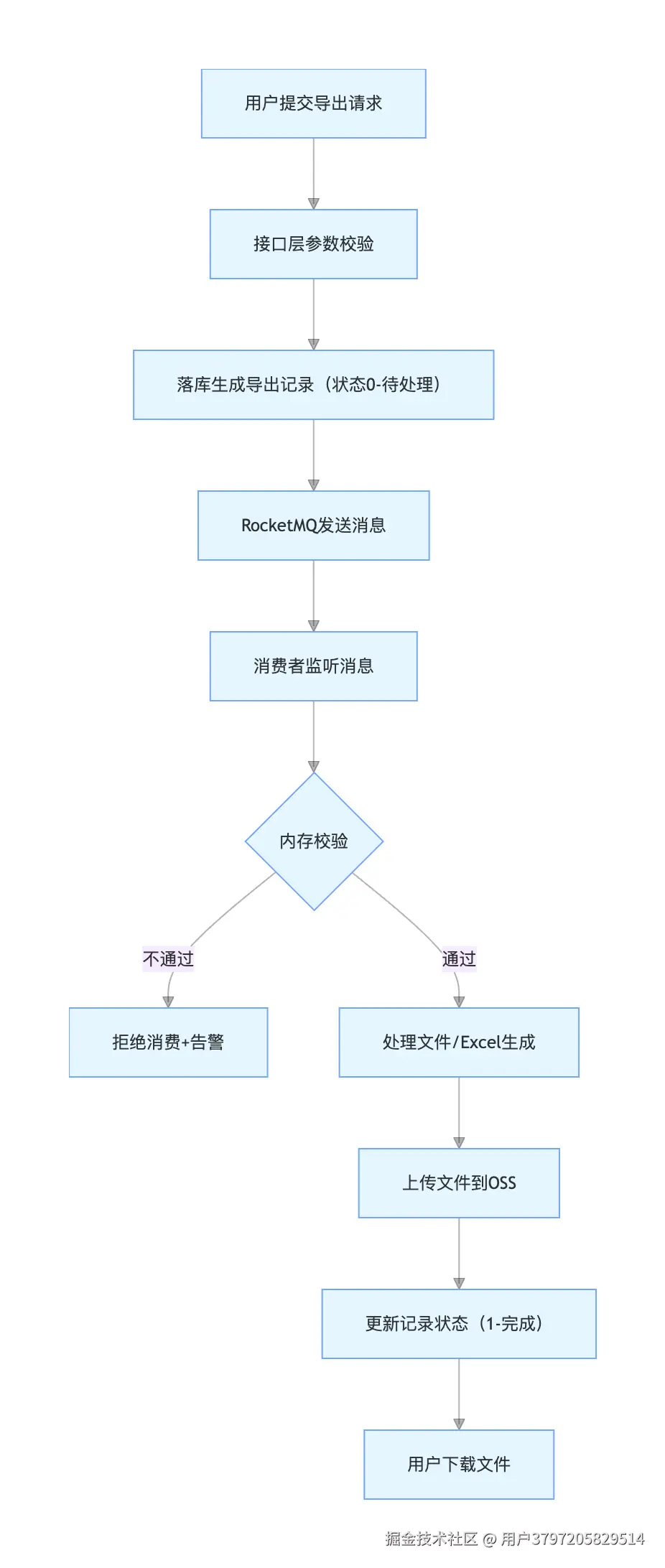 我们的导出系统采用 "接口落库 + MQ 异步消费" 架构:用户提交导出请求后,先写入导出记录表(状态0-待处理),再通过 RocketMQ 发送消息,由消费者异步处理文件打包 / Excel 生成。