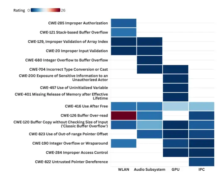 · 无线局域网模块以 CWE-126(缓冲区读越界)为主(25 例),音频子系统模块以 CWE-120(7 例)为主,图形处理器模块和进程间通信模块分别以 CWE-416(9 例)和 CWE-416(8 例)为主。