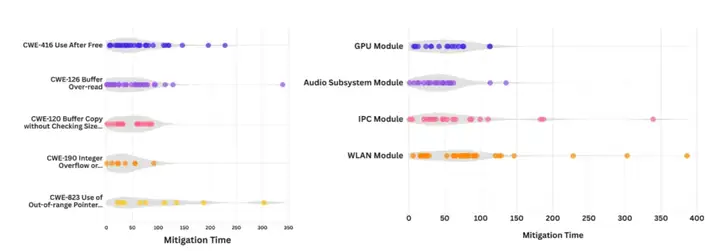 · CWE-120 和 CWE-190(整数溢出或绕回)的缓解时间波动较小,所有 CVE 均在 1-3 个月内完成修复;