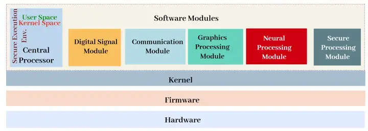 基于功能的子系统隔离:参考骁龙汽车平台、英伟达 DRIVE 等平台,将数字信号模块、通信模块、图形处理模块等进行分离。每个模块均配备固件、驱动程序和面向功能的应用程序接口(API),虽与中央处理器交互,但可半独立运行。其中通信模块、输入输出内存管理单元(IOMMU)、进程间通信(IPC)等多个模块对应 AUTOSAR 平台定义的基础软件模块。但为捕捉现实中的 SoC 集成模式,模型还纳入了神经处理器、图形处理器等模块 ------ 这些模块未在 AUTOSAR 中被明确规定或抽象。这一设计的合理性在于,人工智能加速器和基于高级图形处理器(GPU)的信息娱乐系统在汽车 SoC 中的集成度日益提升。这种混合方法既保持了与 AUTOSAR 面向服务原则的整体对齐,又能适配商用 SoC 平台的架构多样性。