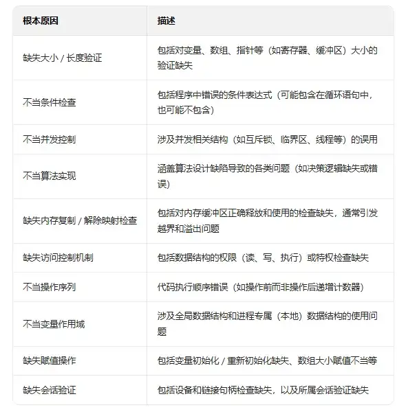 研究结果显示,"缺失大小 / 长度验证" 是最常见的根本原因,涉及 72 个 CVE;其次是 "不当条件检查"(25 个)和 "不当并发控制"(20 个)。