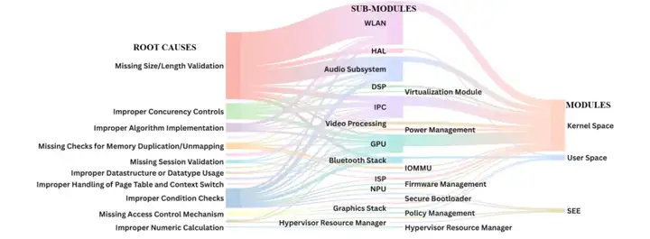 · 31 个 CVE 和 14 个 CVE 分别因 "缺失大小 / 长度验证" 源于无线局域网模块和音频子系统模块(以粗流线表示);