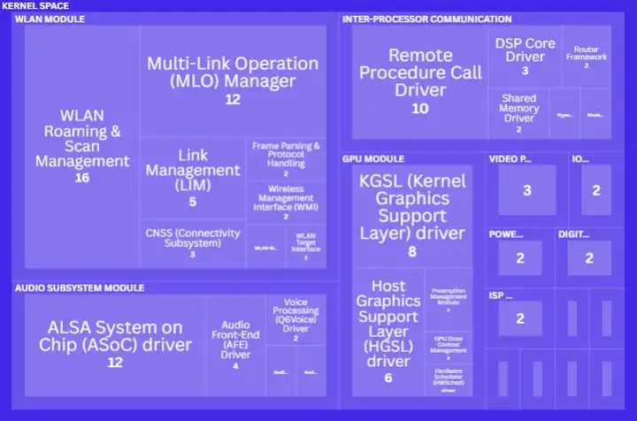 研究结果显示,内核空间、用户空间、安全执行环境的漏洞占比分别为 86.6%、11.9% 和 1.5%。图 5 进一步细化了内核空间的 CVE 分布:从树状图可见,无线局域网(42 个)、音频子系统(22 个)、进程间通信(19 个)、图形处理器(18 个)模块的 CVE 数量最多。对这些模块进一步拆解发现,无线局域网漫游与扫描管理(16 个)、多链路操作(MLO)管理器(12 个)、高级 Linux 声音架构(ALSA)(12 个)子模块的 CVE 数量居首。