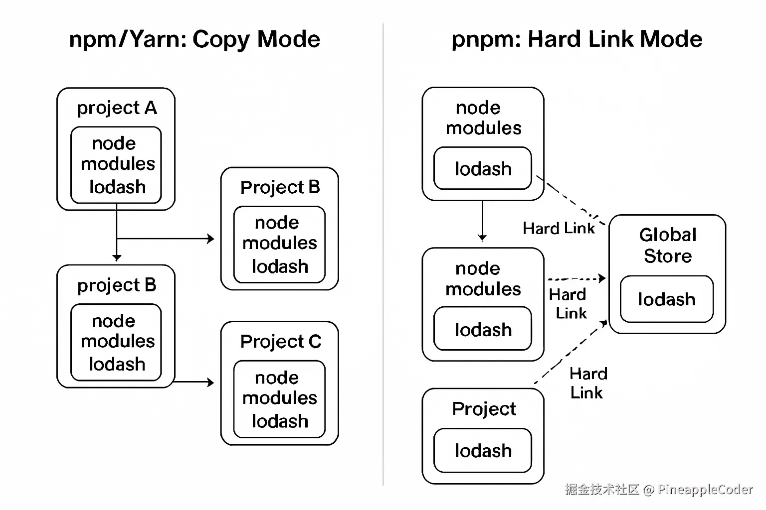pnpm (Performant npm)由 Zoltan Kochan 在 2017 年开发,它的核心思想是: "只存一份,多处使用" 。它通过一种巧妙的文件系统操作,彻底解决了困扰前端多年的 磁盘空间浪费 和 幽灵依赖 问题。