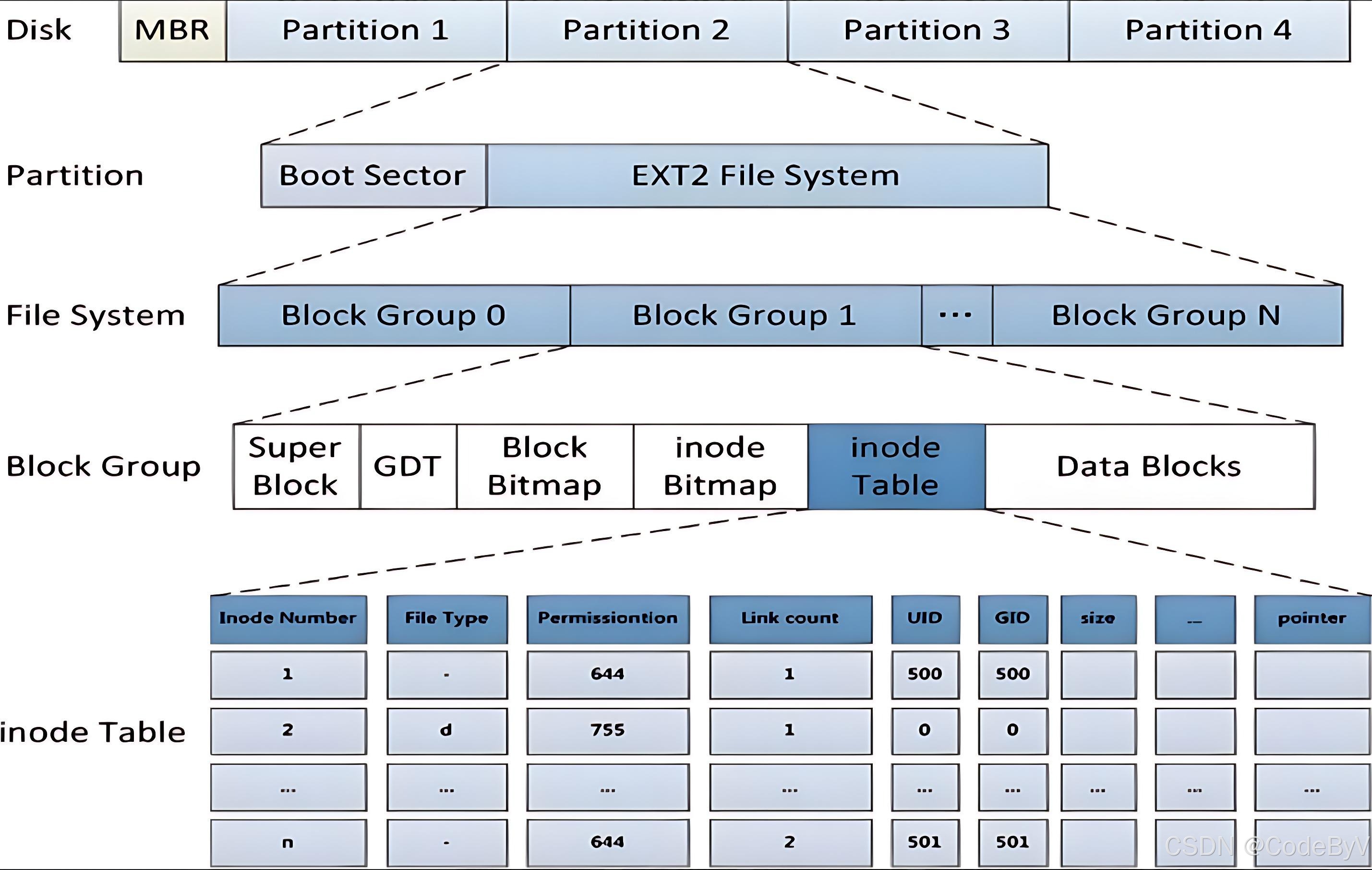 - 核心思想:将大分区划分为多个小的块组,每个块组独立管理自己的inode和数据块,相当于"分区中的小分区";