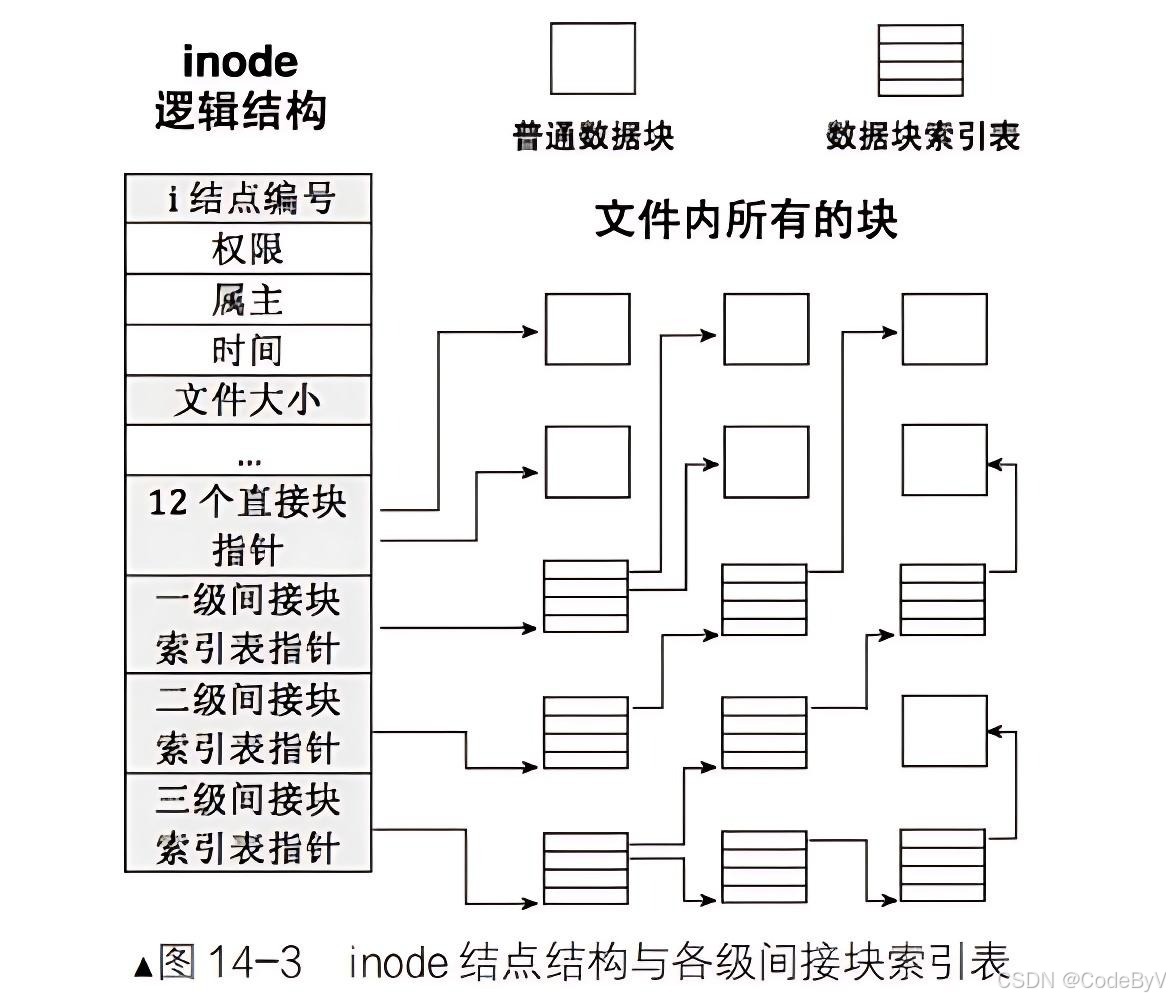 i_block[13]指向一个"二级间接块",该块中存储的是一级间接块的地址,适合大文件(1×(4KB/4B)×(4KB/4B)×4KB=4GB); - 1个三级间接块 :