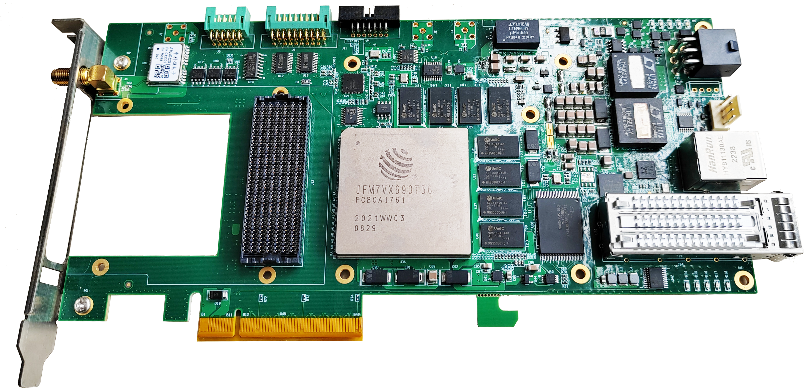 UD PCIe-404全国产化信号处理模块为标准PCIe全高的结构,对外支持PCIe3.0×8通信,也可以采用千兆以太网(RJ45连接器)、万兆以太网(或RapidIO、Aurora,QSFP+连接器)接口进行通信,支持多板级联。模块为100%国产化设计(同时也兼容进口器件)。FPGA芯片可选JFM7VX690T、SMQ7VX690T、BQR7VX690T等,两组DDR3的存储容量分别可配置为2~4GByte。板载有1个FMC+(兼容FMC子板)全互联的接口,满足VITA57.1和VITA57.4规范,可以适配大多数ADC/DAC/光纤 FMC或FMC+子卡。全部器件选择工业级和以上质量等级元器件。