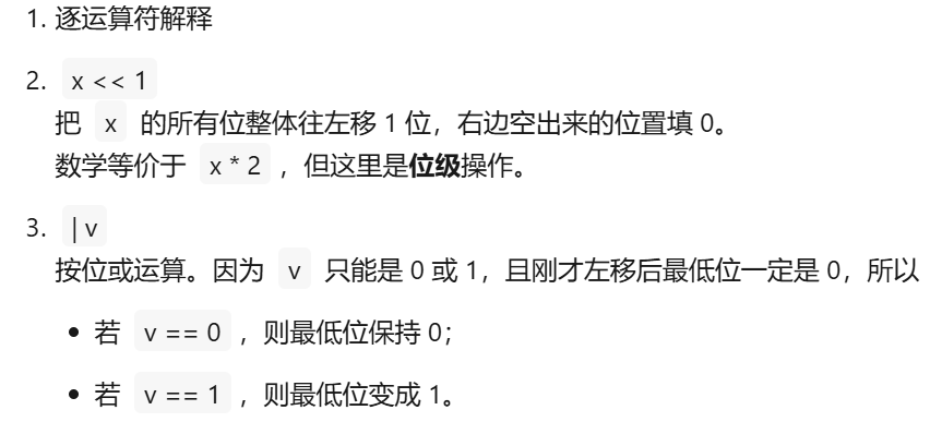 比如 nums=[1,1,0,1],每个前缀对应的二进制数分别为 1,11,110,1101。如何计算这些二进制数呢?在十进制中,我们往 12 的右边添加 3,得到 123,做法是 12⋅10+3=123。对于二进制,做法类似,往 110 的右边添加 1,得到 1101,做法是 110⋅2+1=1101,或者 110 << 1 ∣ 1=1101。