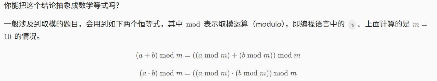 **模运算对乘法和加法具有分配律,所以每一步更新时都可以先取模再运算,不影响最终模 5 的结果。**这样既节省了空间,又避免了超大整数问题。