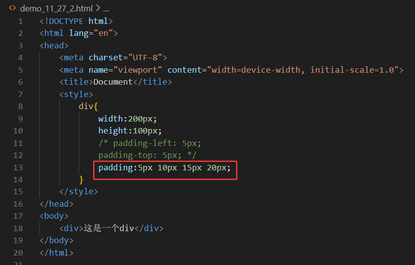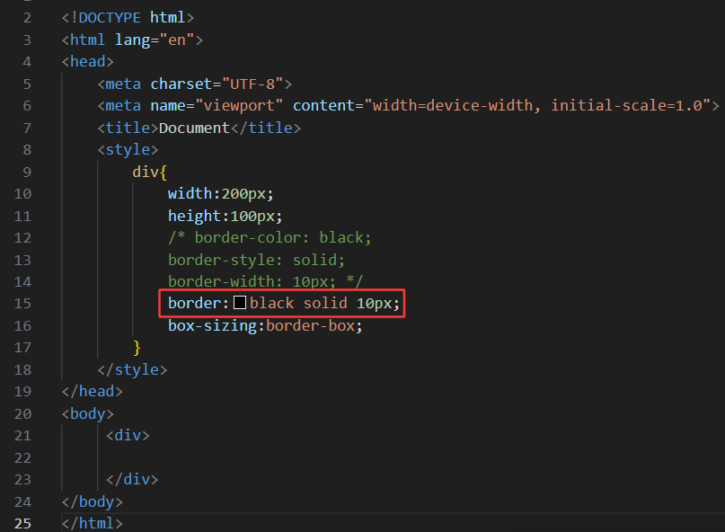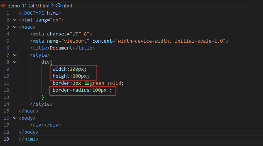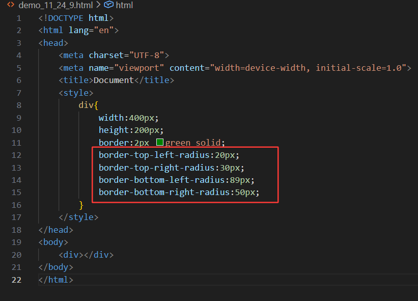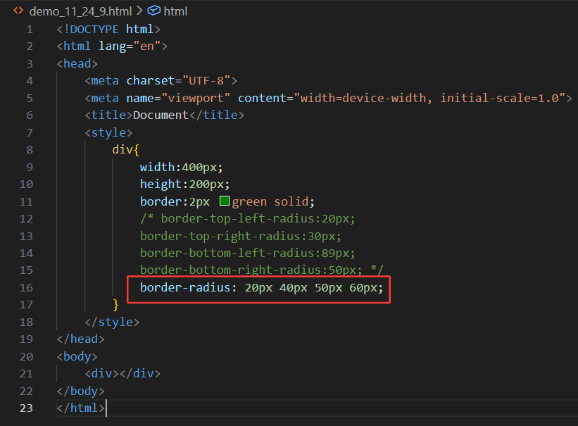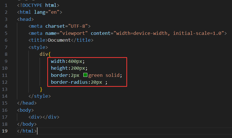 上图11行是设置边框大小为2px,颜色为绿色,solid表示是实线,12行是内切圆半径是20px