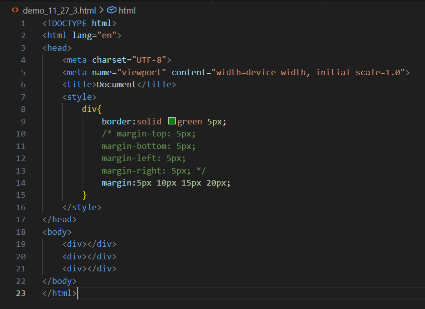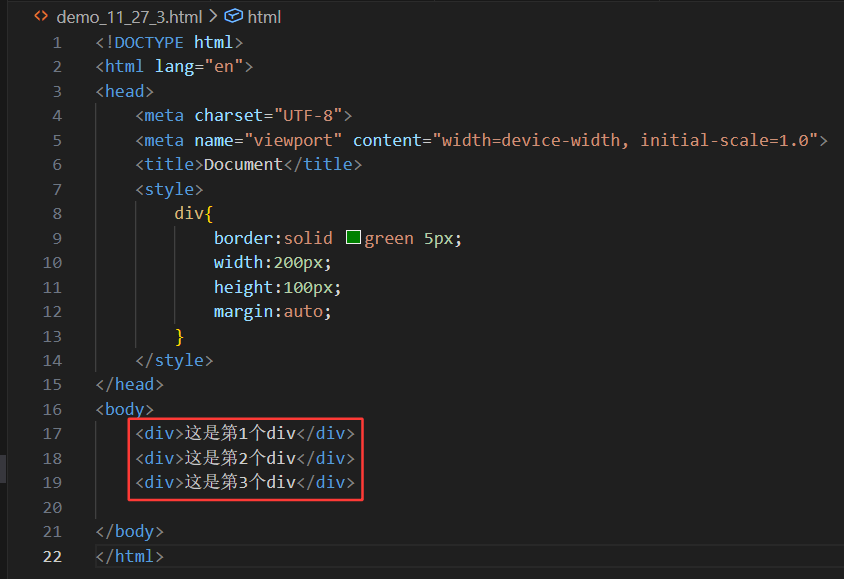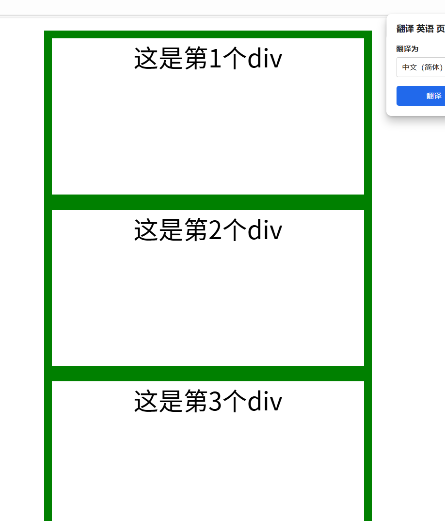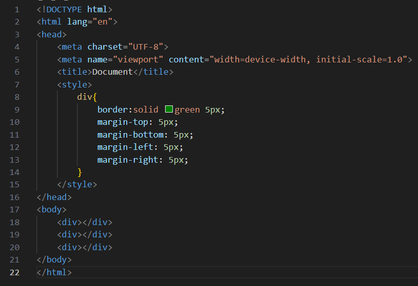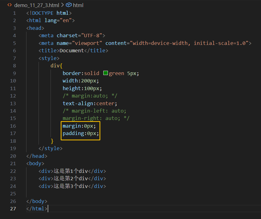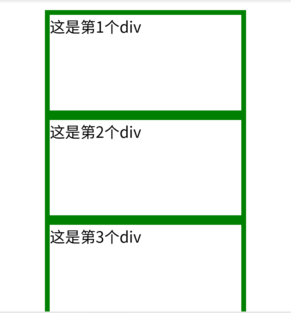 根据上图浏览器中显示的结果可知,写的3个div全都挤在一起了,相当于是外边距为0,因为浏览器里面是默认外边距为0,那么我们可以自己来设置外边距