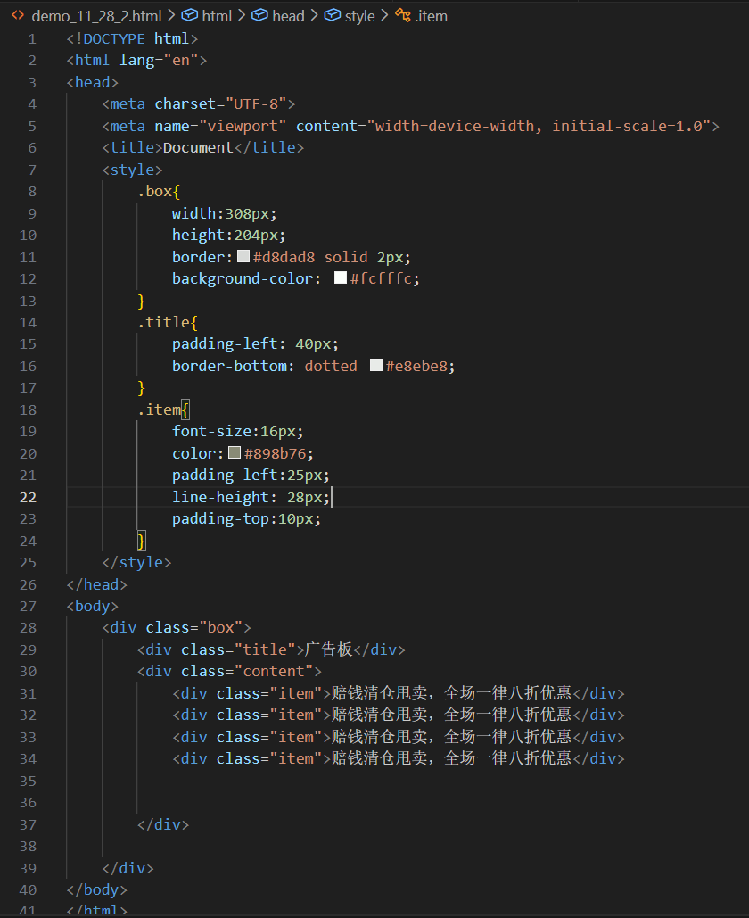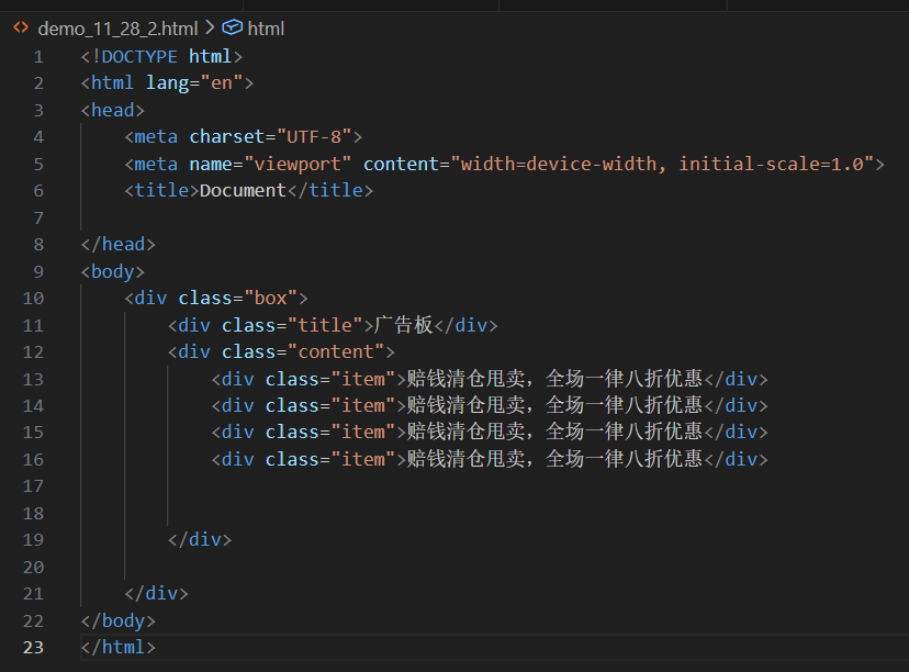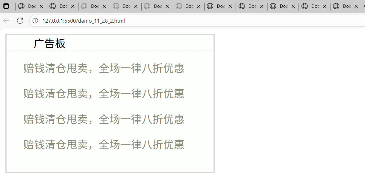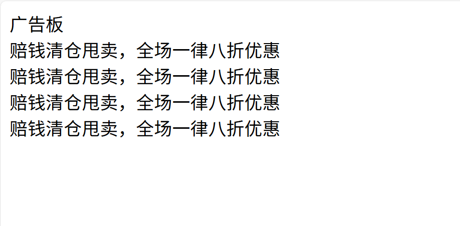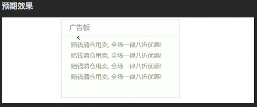 注意:图9中老师的++思路++是:可以将广告板外面的边框看作为是一个div,然后广告版这3个字那一行也可以看作为是一个div,下面的四行"赔钱......优惠"也可以看作为是一个div