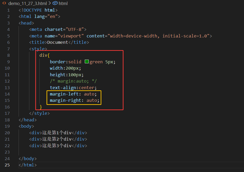 那么还可以写margin-left:auto和margin-right:auto,如下图所示14 15行内容可替代12行内容