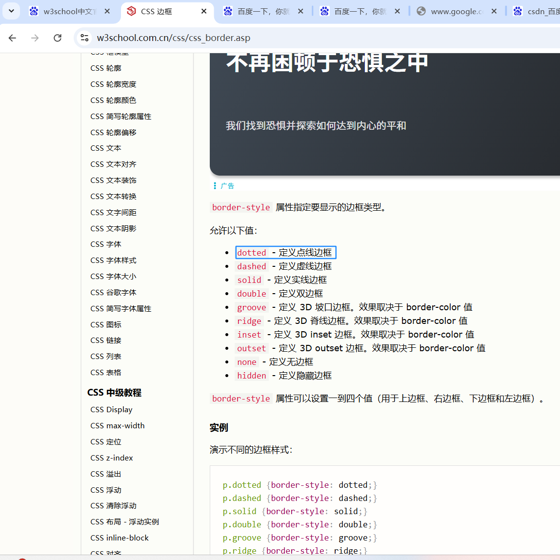 然后属性值有:实线边框是solid 虚线边框是dashed 点线边框是dotted