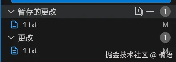 此时,我们对代存节点的状态(工作区和暂存区)进行修改(在1.txt中输入文字):