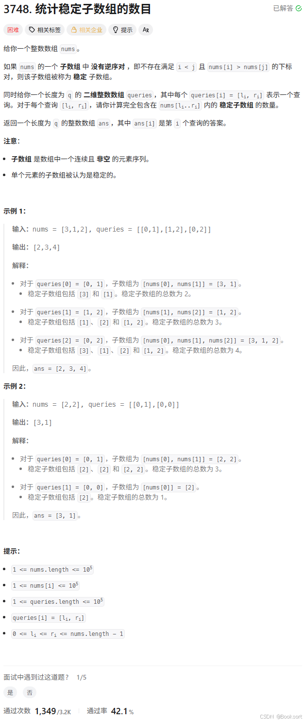 1、分析题目,定义稳定子数组,即一个非递减区间的子数组 ,一个数组中,有很多块非递减区间的子数组,需要找找各个子数组是否符合非递减的特性