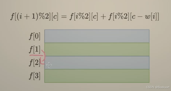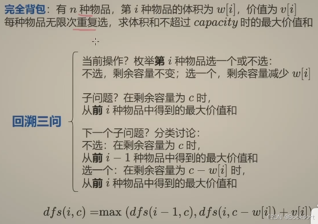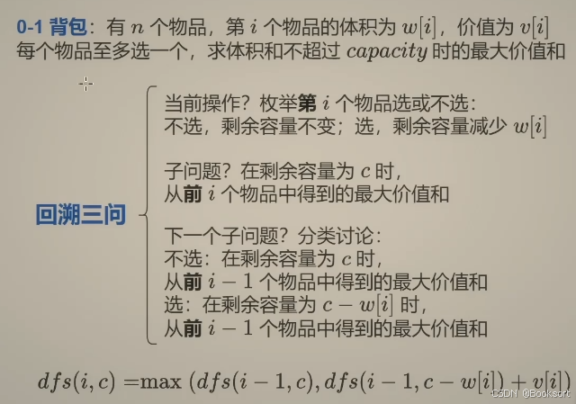 下一个子问题:第i个物品不选:problem(i-1,c)的最大价值;第i个物品选:problem(i-1,c-c[i])+v[i]的最大价值,