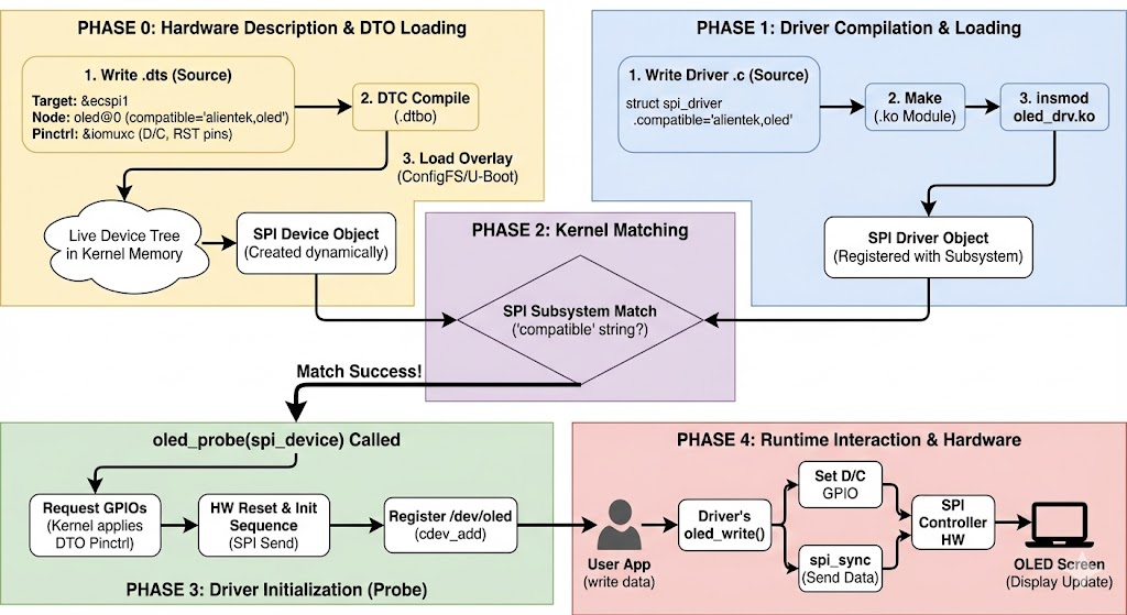 系统启动,解析设备树中的 OLED 节点,生成 struct spi_device 并注册到 SPI 总线。