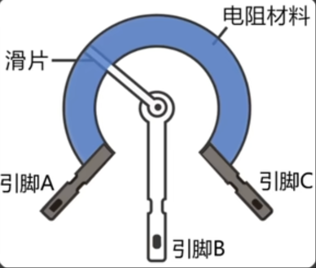 结构:有电阻材料、滑片、引脚组成,滑片可以与电阻轨道的不同位置接触,从而改变电阻值。