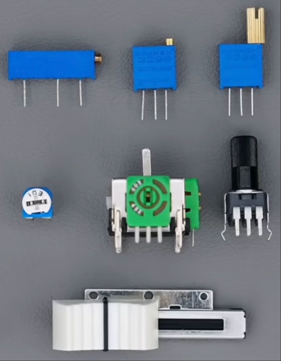 概述:相比于固定电阻,多了一个调节结构,常见的封装类型有:旋转式、滑动式等