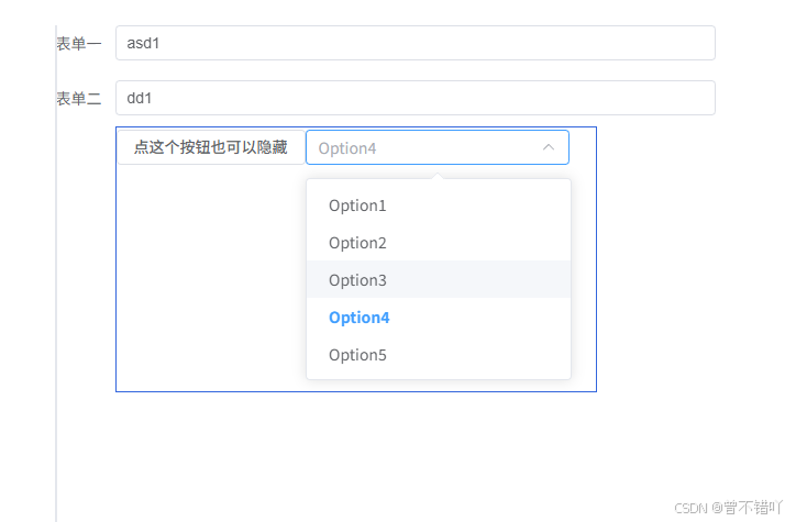 <el-button @click="hideDropdown('input1')">点这个按钮也可以隐藏</el-button>