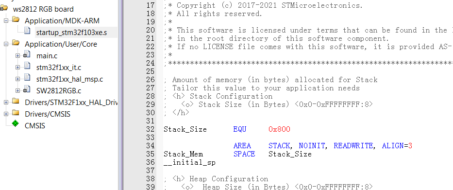 这里把最小栈空间设大,以满足我们PWM的DMA一次性操作较多WS2812数据的要求。