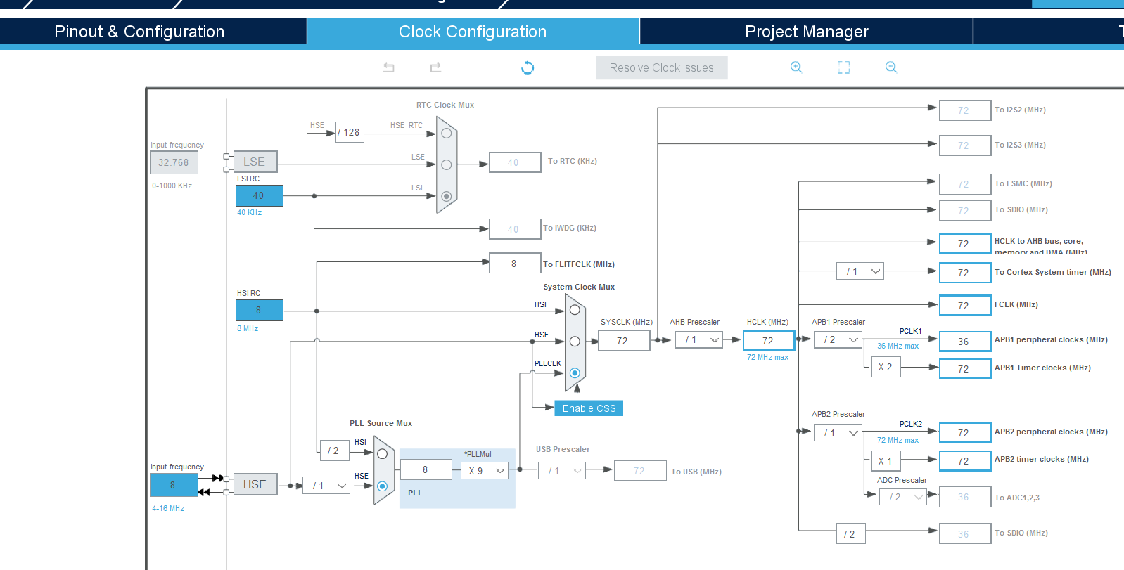 时钟使用的是外部8MHz晶振进行9倍频到72MHz。