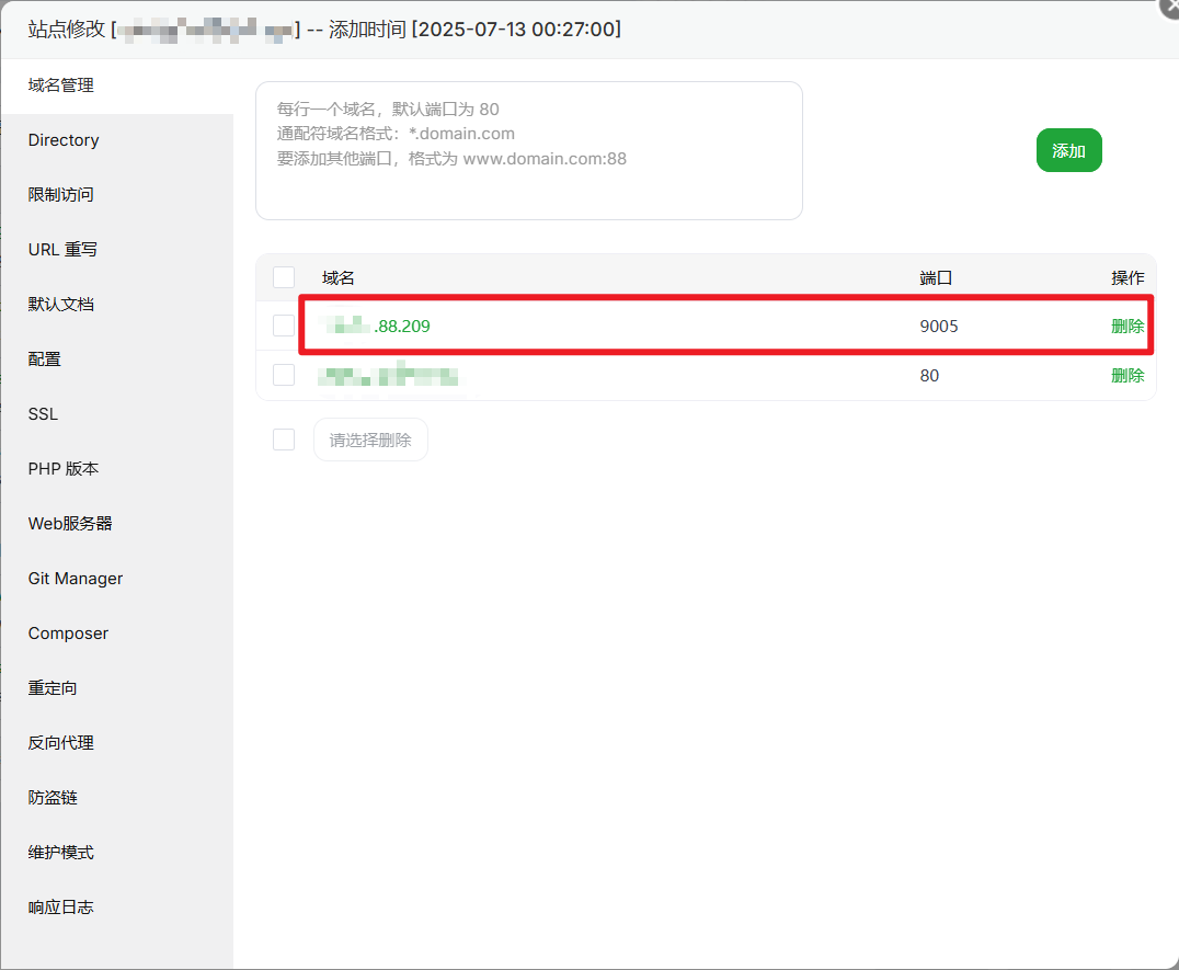 3、给网站分配公网ip端口地址,设置成没在用的端口就行,实现公网ip地址加端口号就能访问,例如我这里用宝塔给网站分配了9005端口。