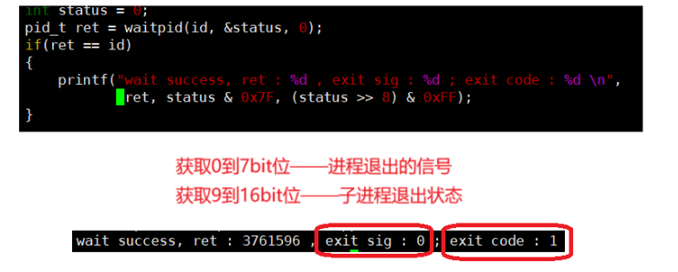 //printf("wait success, ret : %d , exit sig : %d ; exit code : %d \n",
