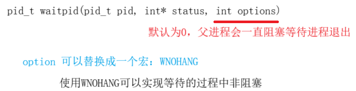 每一个子进程的PCB中也有一个等待队列,当父进程想要回收子进程的时候,子进程就会让父进程处于该等待队列中,waitpid如果一直回收不到子进程,就会一直处于阻塞等待状态。而waitpid第三个参数options可以选择父进程等待的方式。