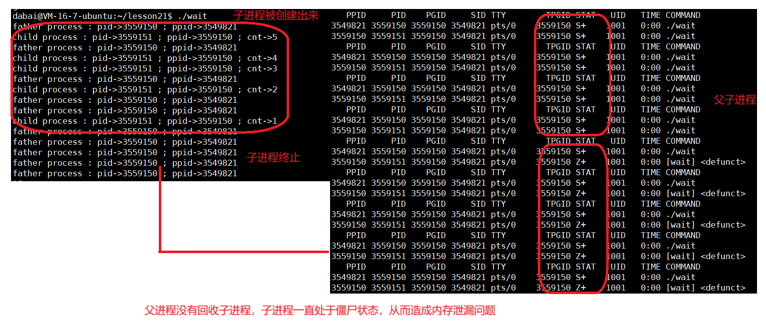 - 子进程退出,父进程如果不管,就会导致子进程变成僵尸进程,进而导致内存泄漏