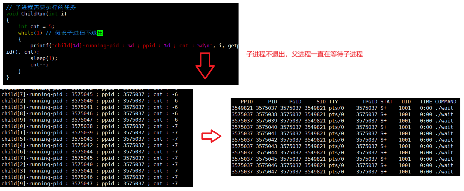 上述代码演示了父进程轮询等待子进程。父进程等待子进程,子进程没有终止,父进程会返回0,让父进程处于循环中,再次循环等待。